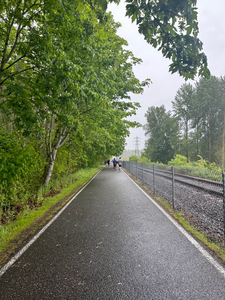 The weather forecast said clouds, but no rain, which sounded great. When we arrived, it became clear that the clouds were low enough that they were indistinguishable from light, persistent rain. Less great. Parking was easy in the Oaks Park lot and we arrived with plenty of time to wait in line at the portapotties before the start.