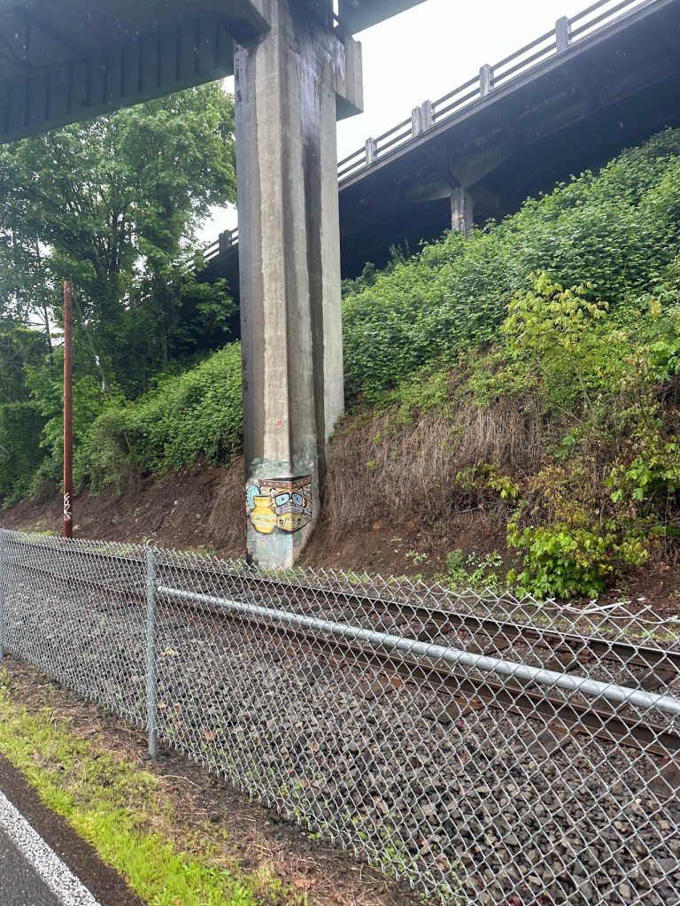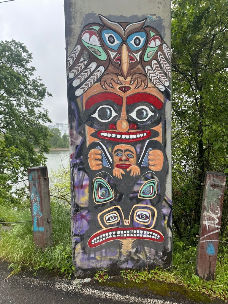 As promised, the course was largely very flat. I thought it might be a little dull to run alongside the Willamette, having had some fairly dull runs next to the Columbia on both sides of the river, but the majority of the graffiti (if that’s what it should be called – probably not) was actually Northwest tribal art. This kept me entertained both ways, as I spotted new art on both sides of pillars and walls the whole way through. My favorite was this progression from tribal to realistic salmon.