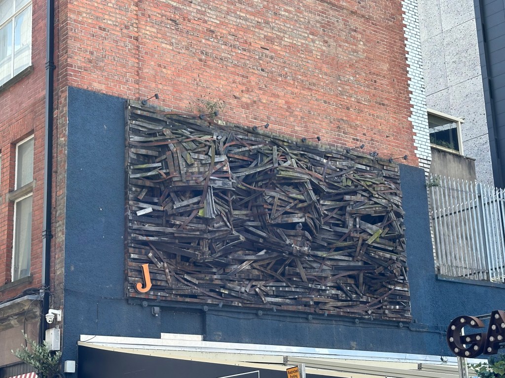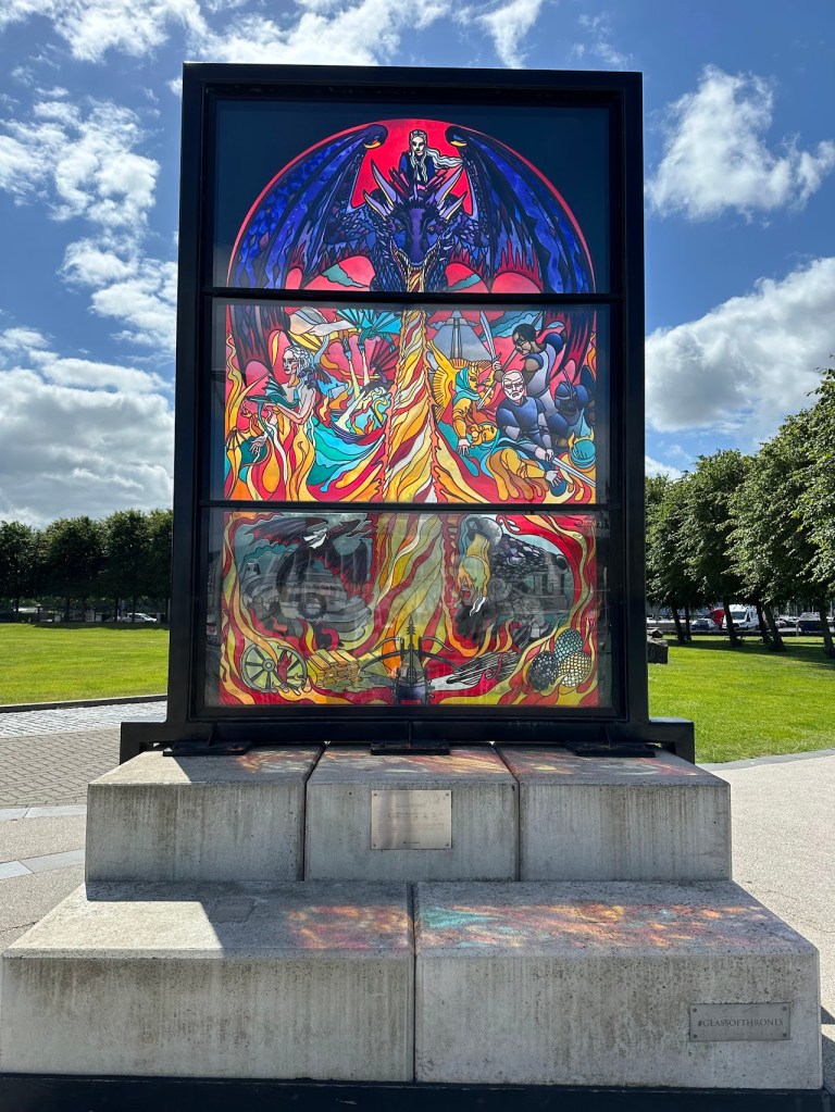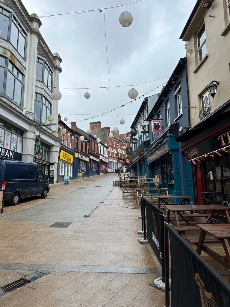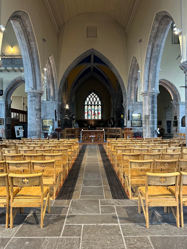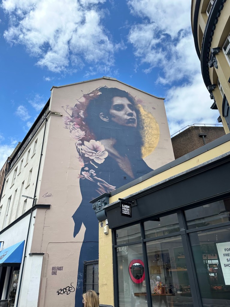 Unfortunately, due to the heat and the lack of either a fan or AC in our Airbnb (which did have AC listed as an amenity when I booked it), I got approximately three hours of sleep our first night in Galway. My husband awoke to a screenshot of a hotel room with AC that I found while laying awake at 2 am, and jumped into action trying to salvage the day for me – lots of caffeine, dropping off our laundry at a launderer (so affordable!), picking up food, and making a plan that didn’t involve me, exhausted, trying to navigate us by car. Mostly, that involved using the half day after our clothes were done to walk around Galway. Spoiler: our assumptions about it were correct. The main tourist drag was like a repeating cartoon background of pub food – coffee shop – tourist shop – random shop. We tried to wander away from the tourist area and found that most of the roads in the area specifically curved back to it, so we kept finding ourselves either there or the square immediately adjacent. We did find an old cathedral that allowed us to wander around inside and read about the history of the area and the cathedral itself, so it wasn’t a total loss, but I was glad to get on the train to Belfast the next day.
